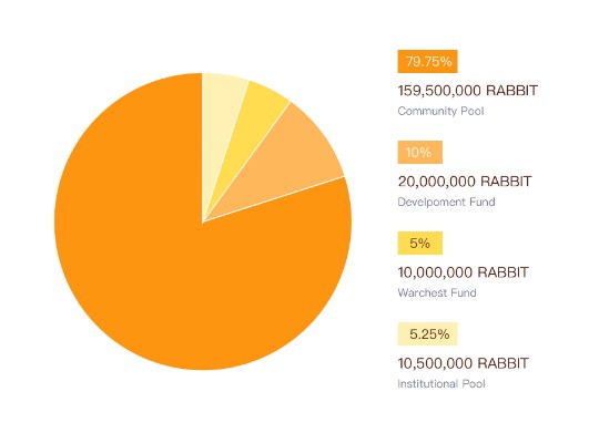 Der RABBIT-Token wird über einen Zeitraum von zwei Jahren mit einem verrottenden Emissionsplan veröffentlicht und als Belohnung für die Gemeinschaft gleichmäßig über das Ökosystem verteilt.